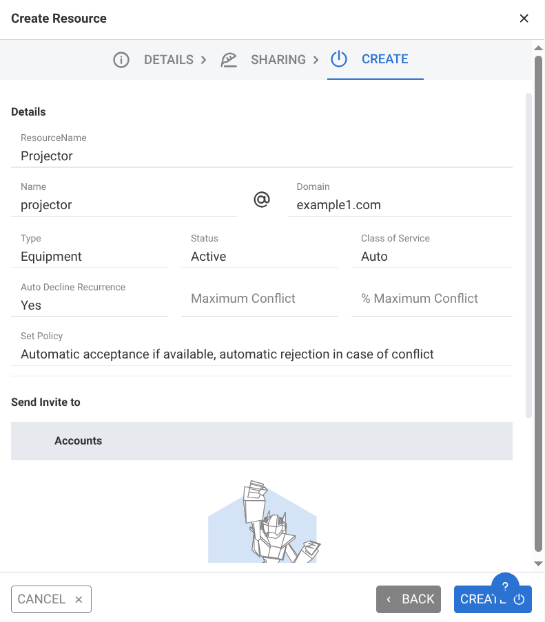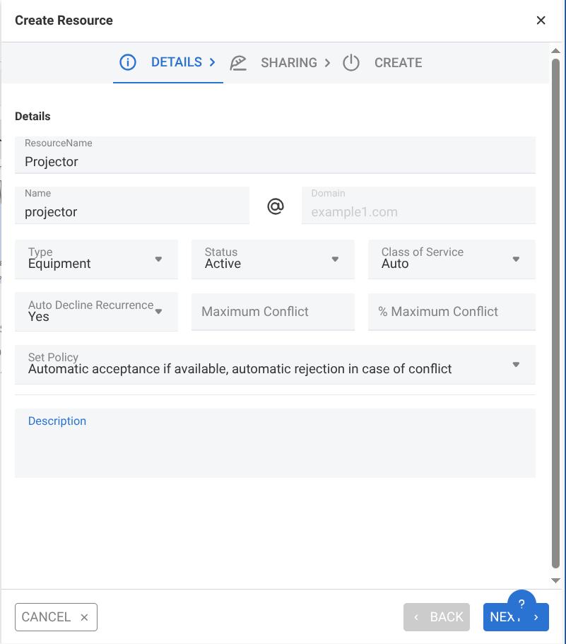 Fill in all the necessary information. In this example, we create a projector, which is a piece of equipment. Its recurrent use is not allowed, which means it must be reserved each time. As a policy, the projector is reserved if not already booked, otherwise it will not be possible to reserve it. The projector is also automatically assigned an e-mail address