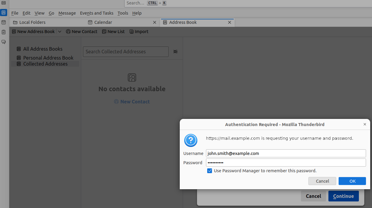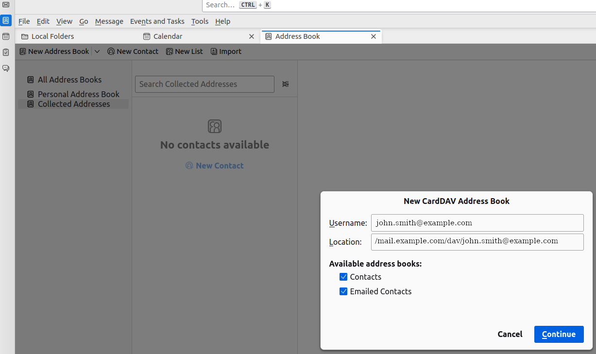 In this scenario, the user john.smith@example.com wants to import in Mozilla’s Thunderbird an address book from the domain mail.example.com. In the remainder, replace these values with suitable ones.